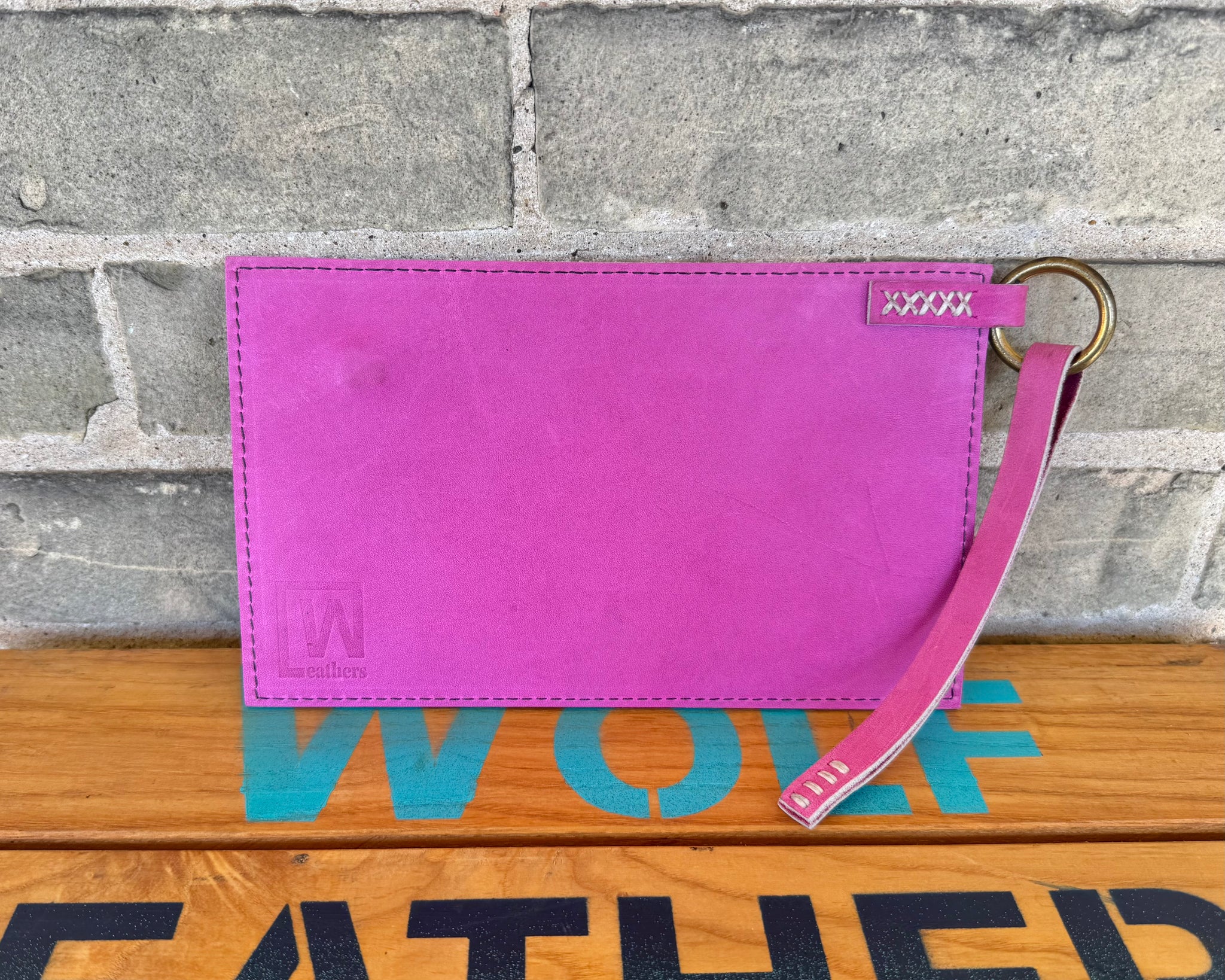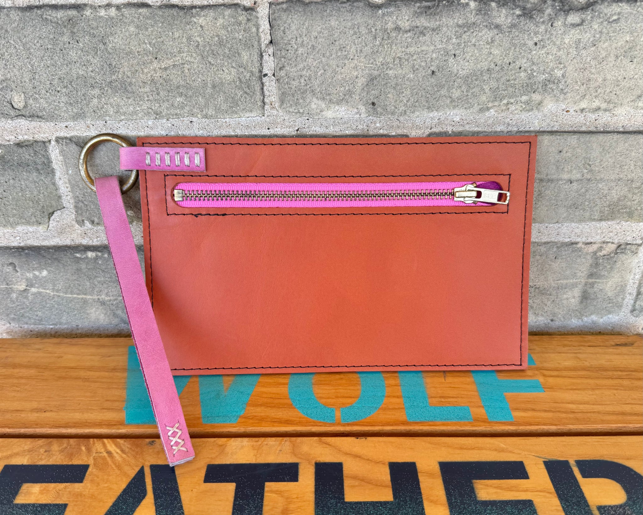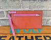 - Signal orange leather with pink zipper on the front and hot pink leather on the back