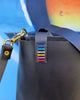 - Blue, white, yellow, pink and red fade stitching at the attachment points