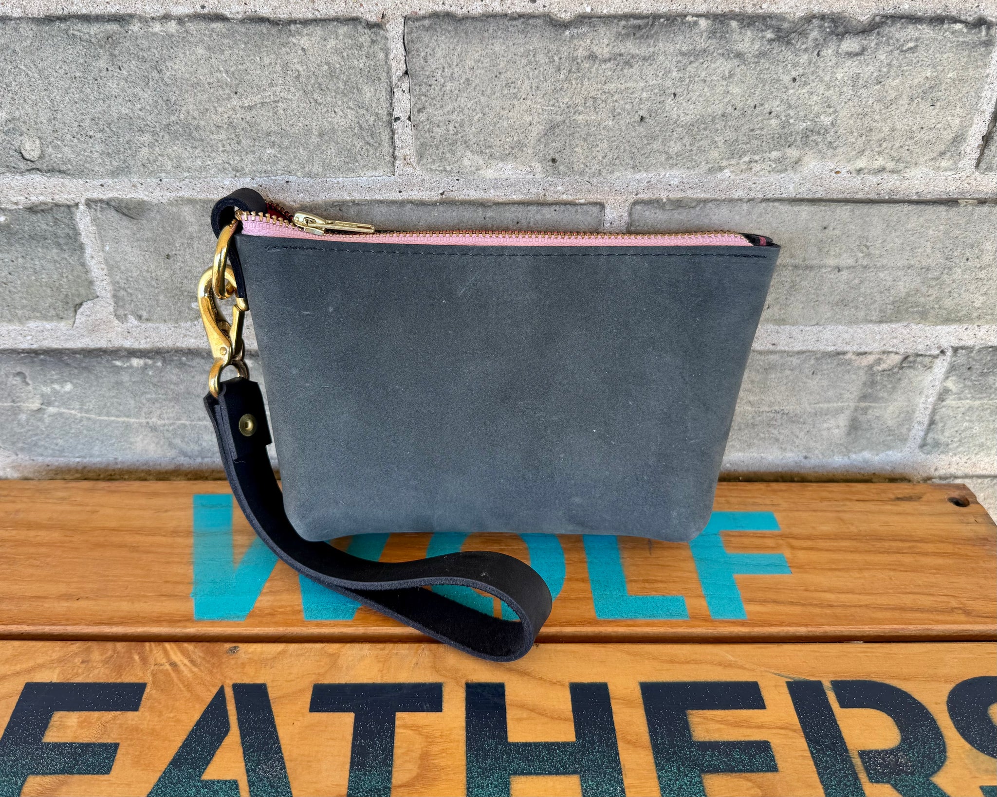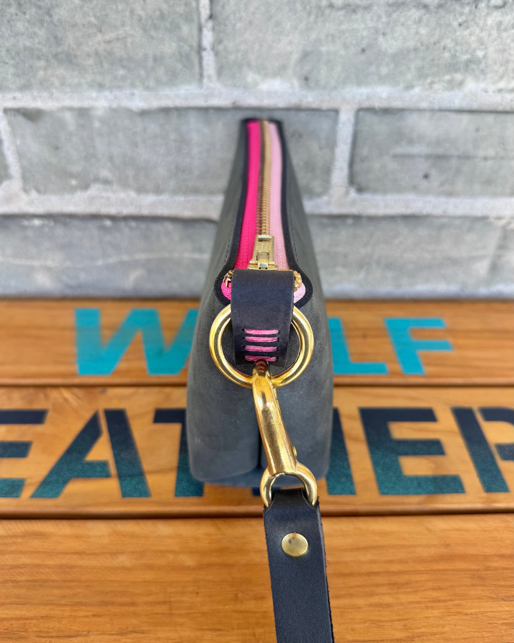 • Charcoal gray nubuck leather with half pale pink, half hot pink zipper, charcoal tab, pink stitching