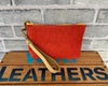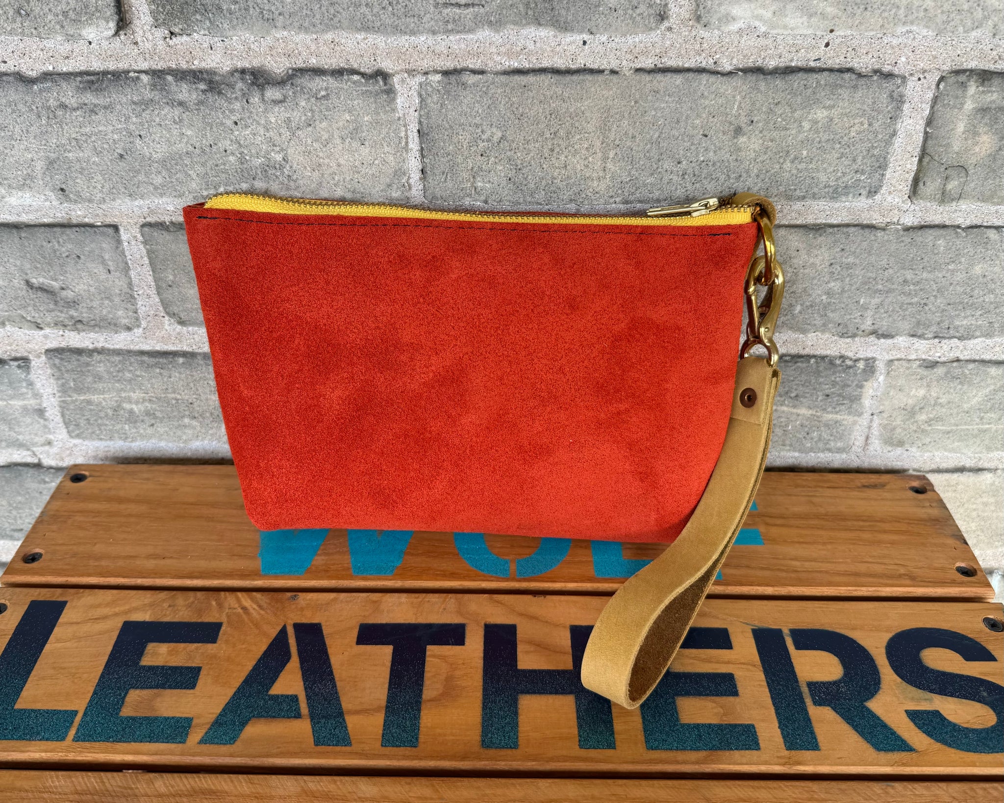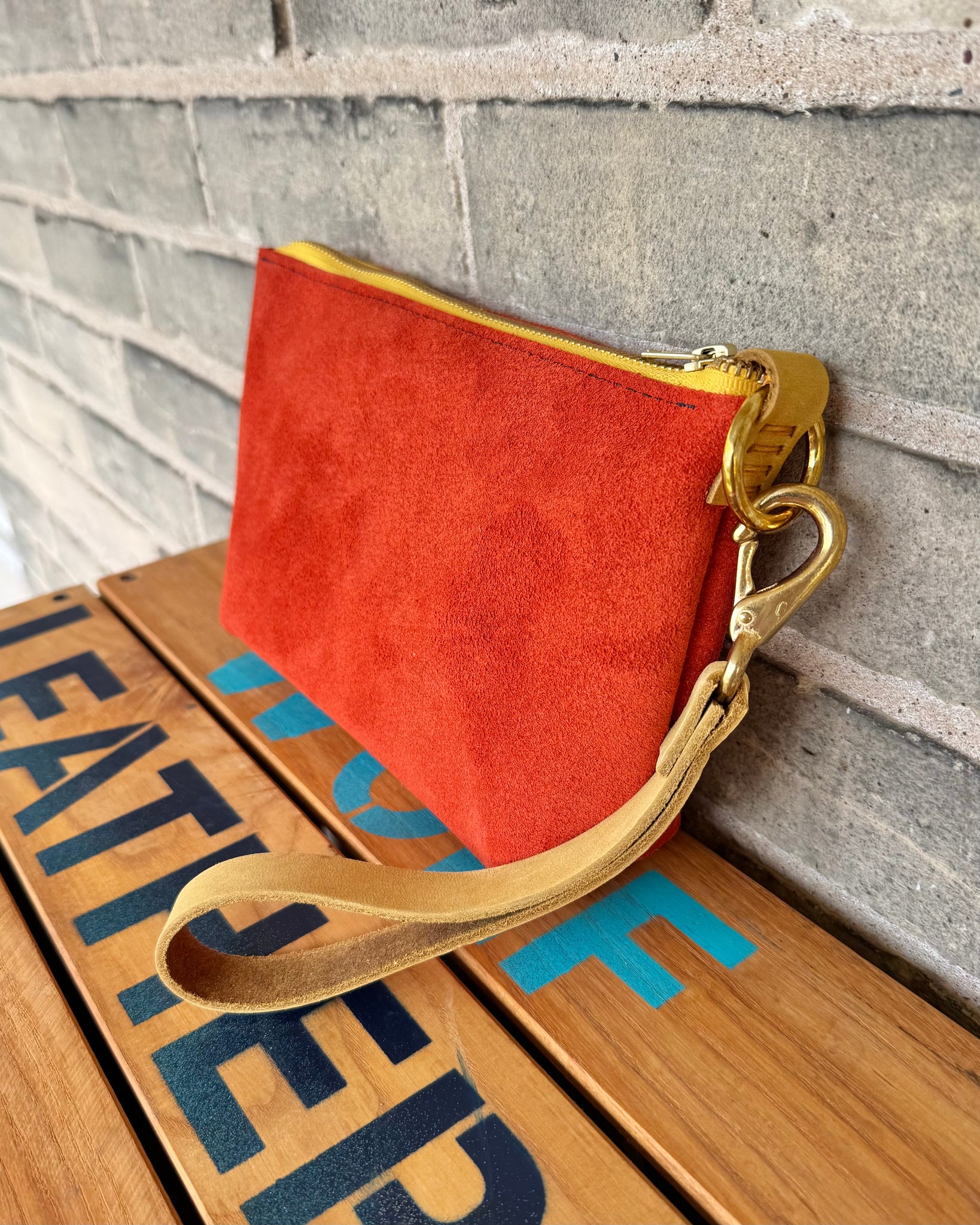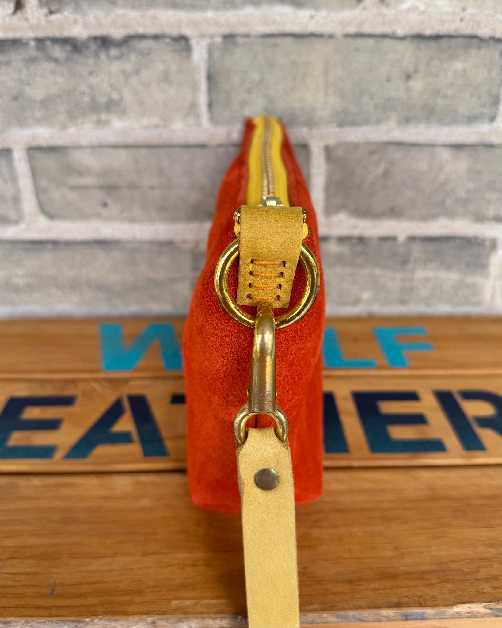 • Orange suede leather with yellow zipper, limoncello yellow tab, topaz gold stitching