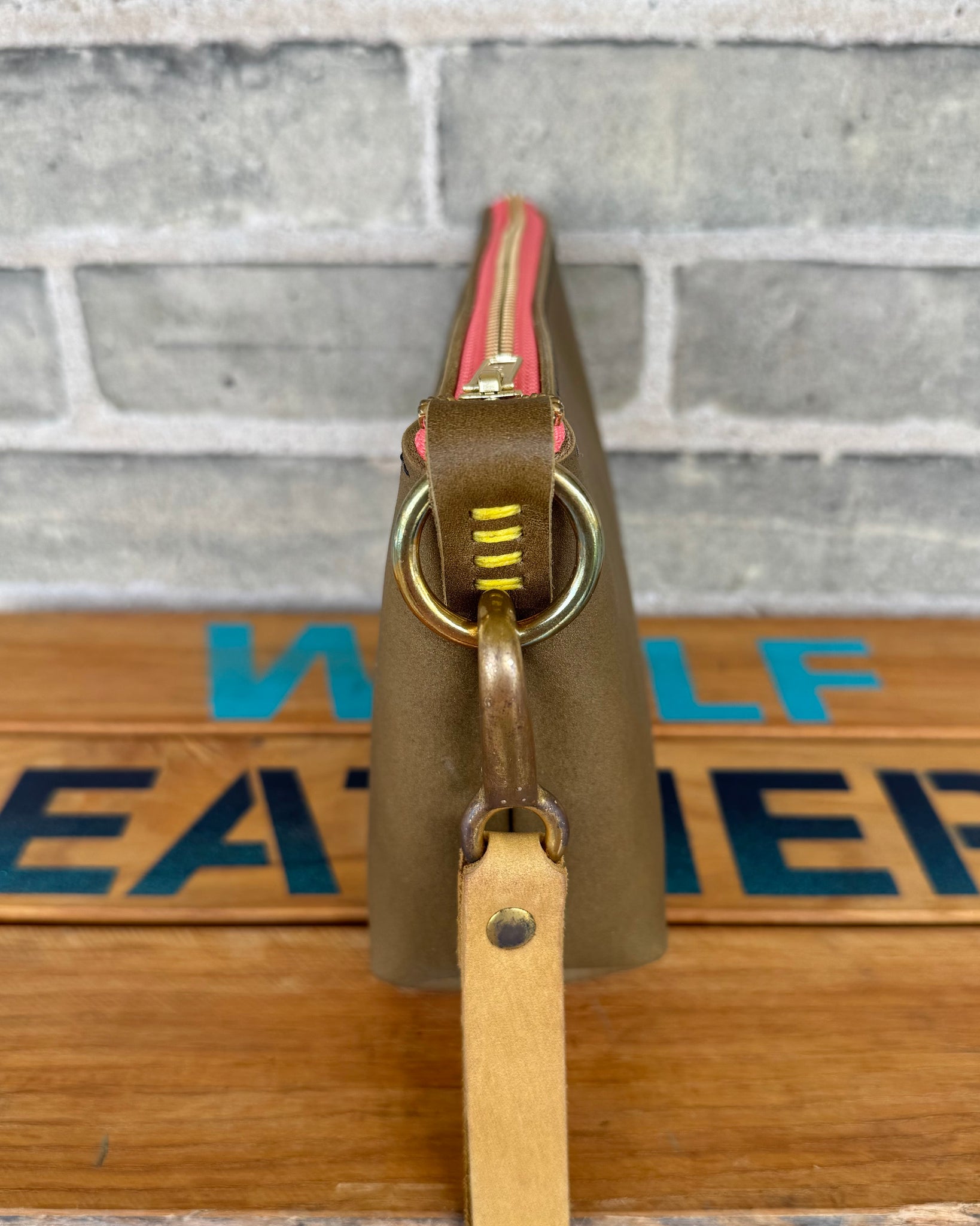 • Olive green leather with peach zipper, olive green tab, yellow stitching