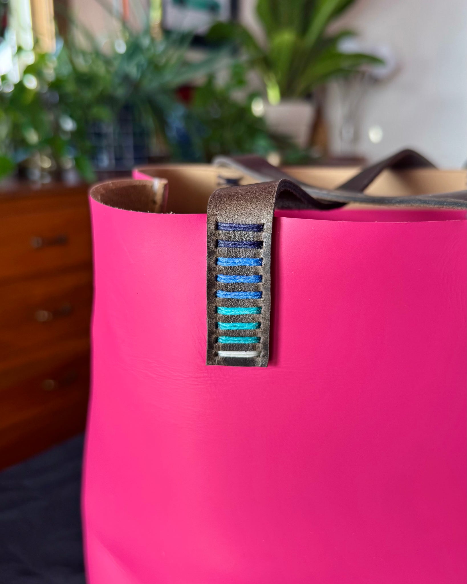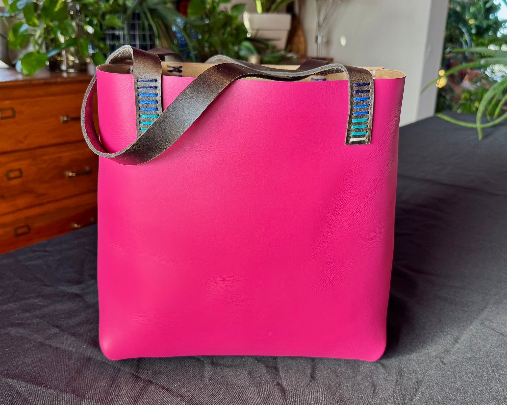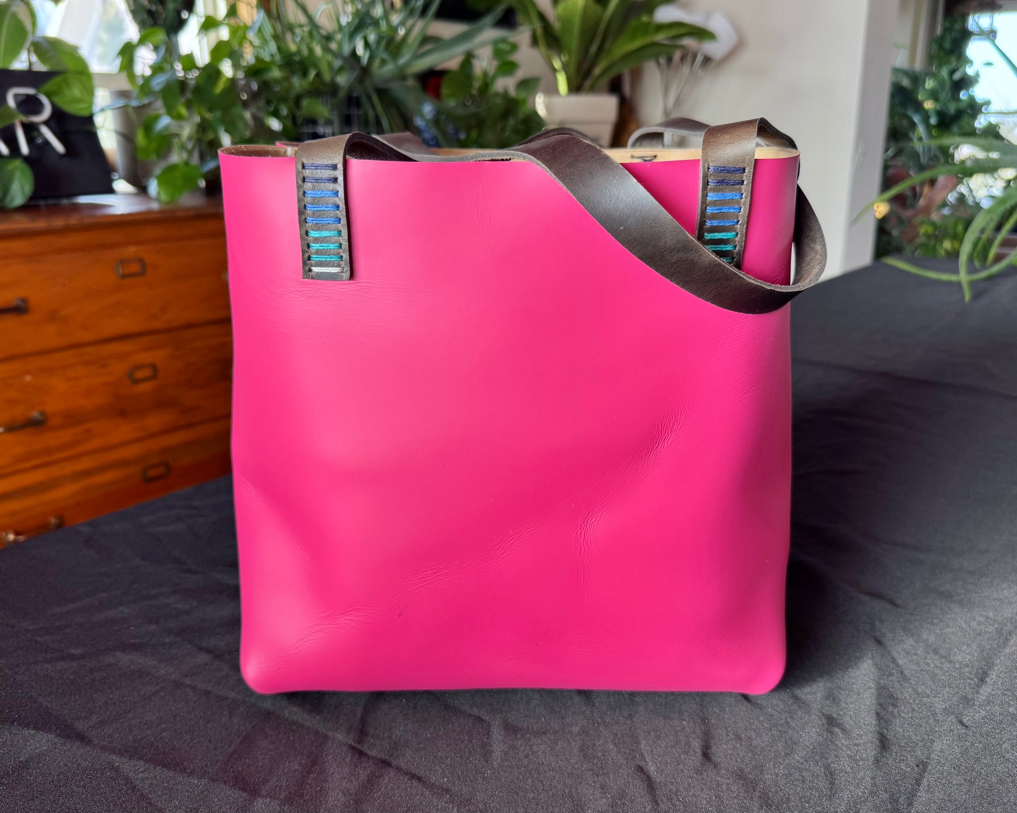 • Magenta pink leather with bronze straps