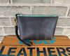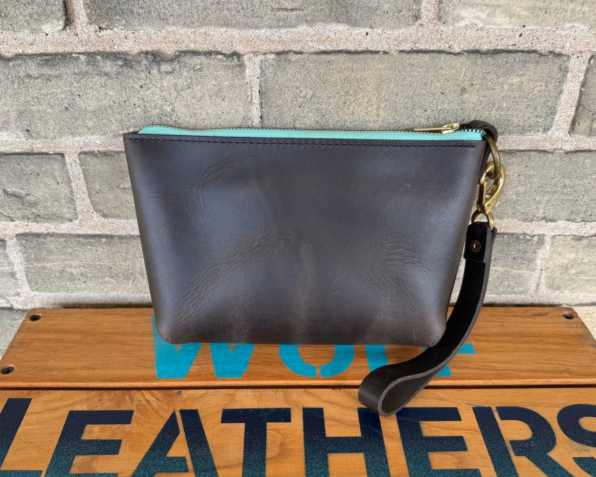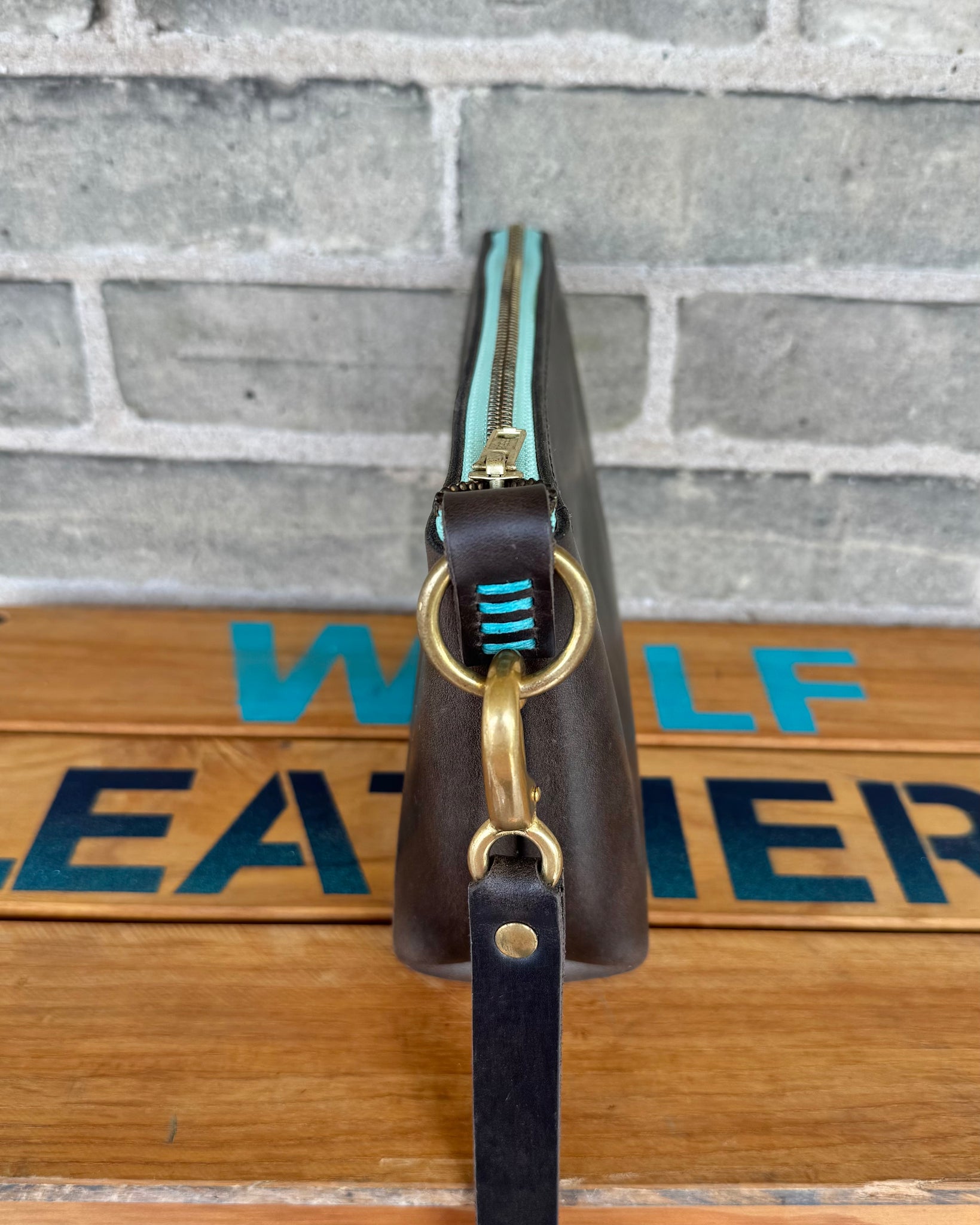 • Bronze leather with mint zipper, bronze tab, turquoise stitching