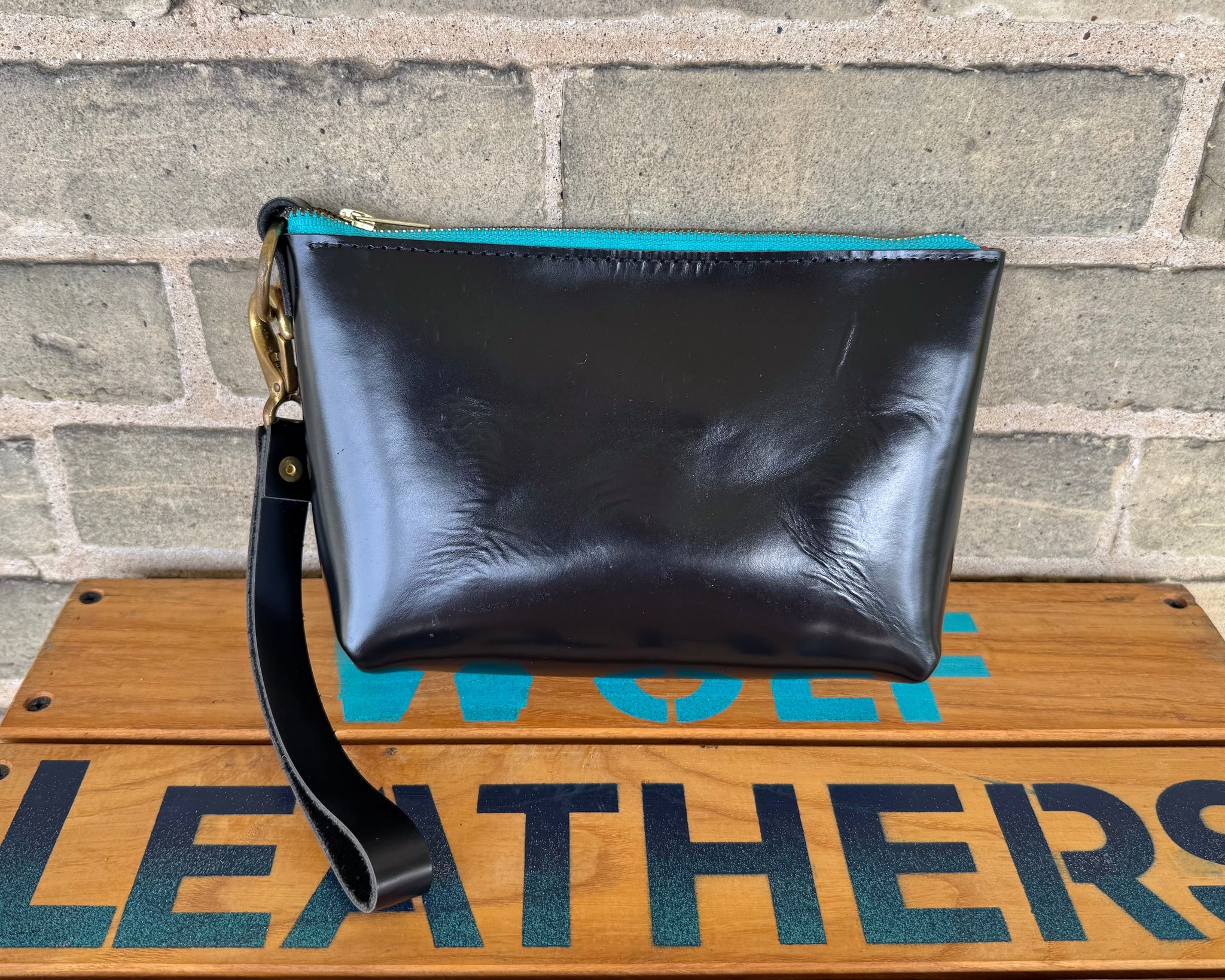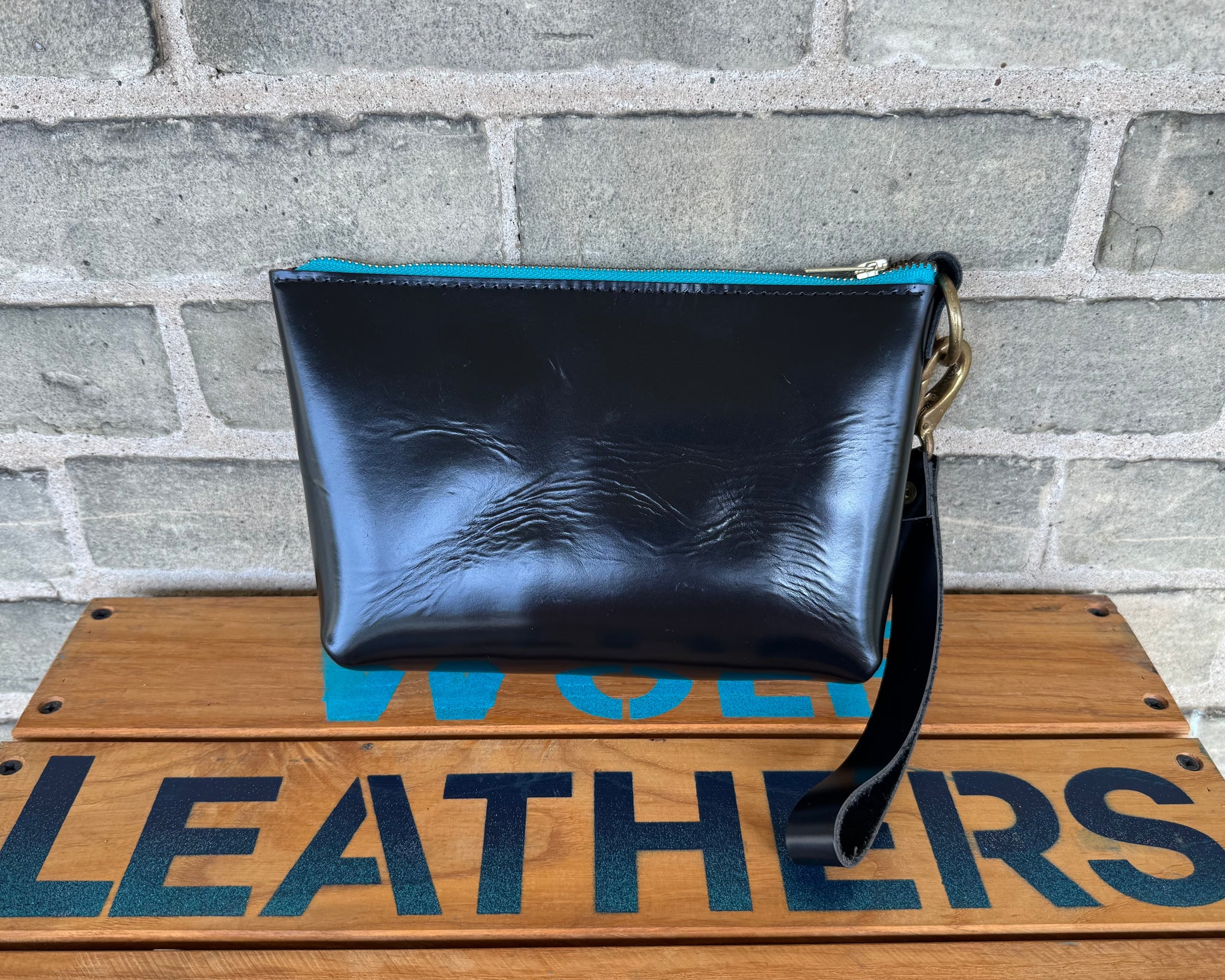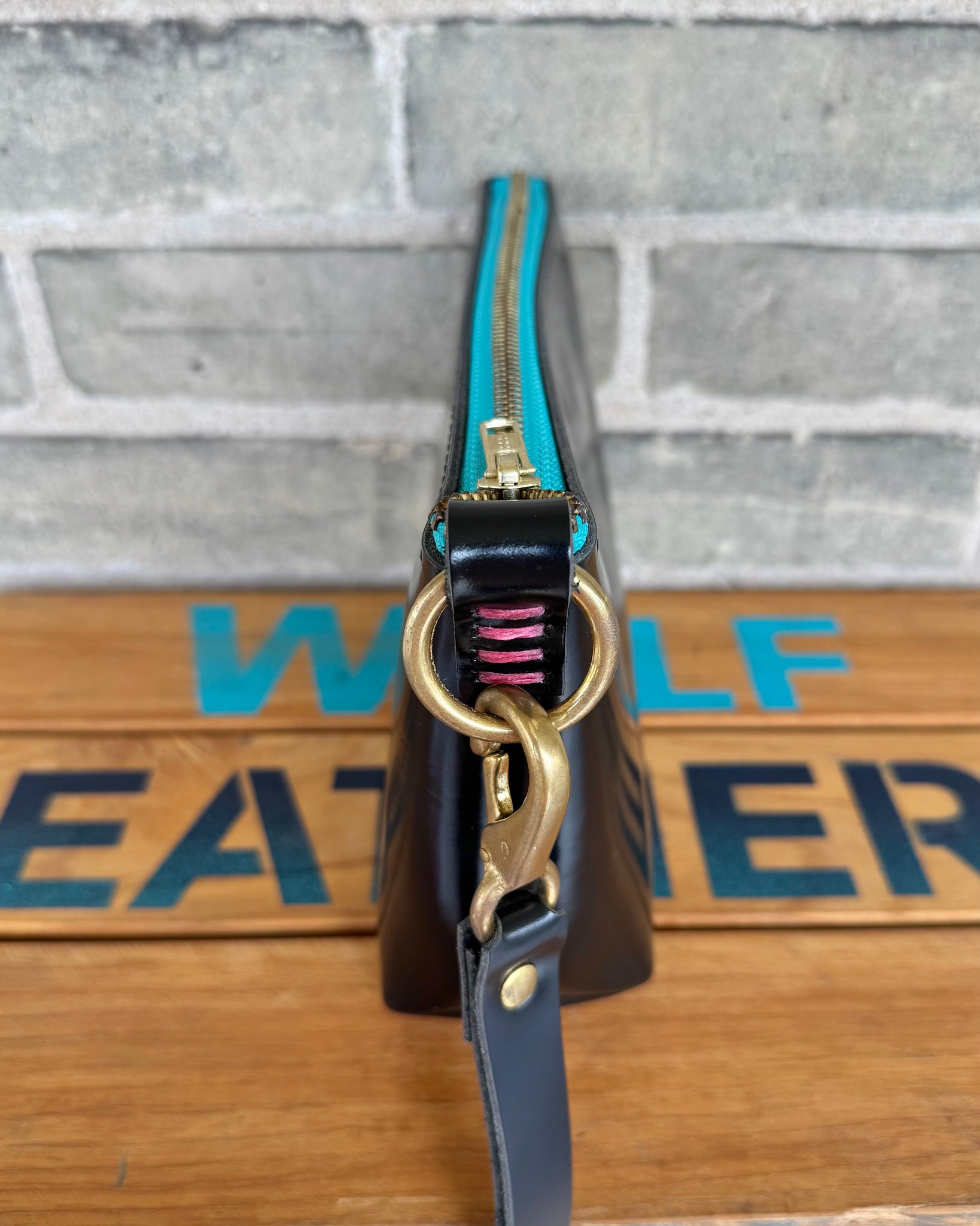 • Olympic black leather with blue zipper, olympic black tab, pink stitching