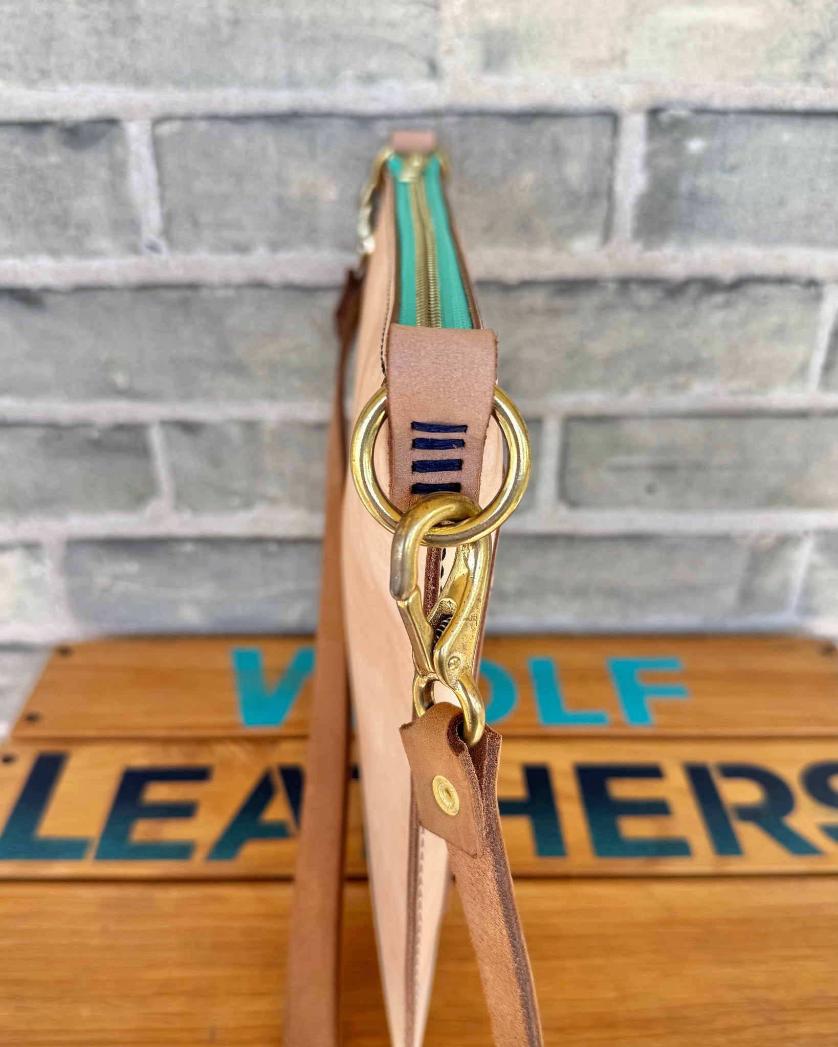 - Light tan leather with jade green zippers